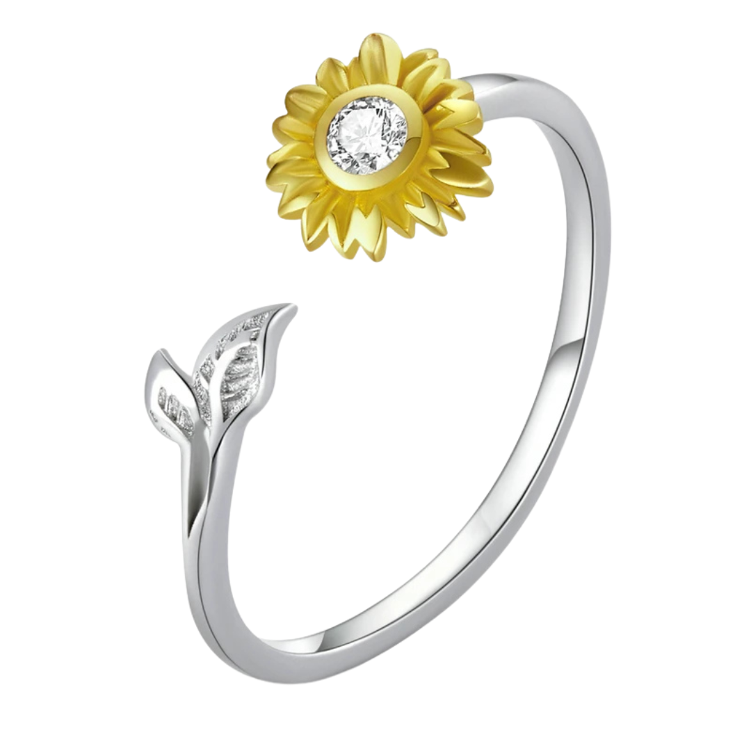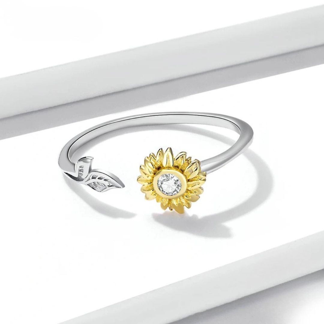 Ilumina tu estilo con el Anillo Girasol Ajustable en Plata de Ley 925. Su diseño combina un girasol bañado en dorado con hojas plateadas, resaltado por un brillante cristal cúbico que simboliza energía, vitalidad y alegría.