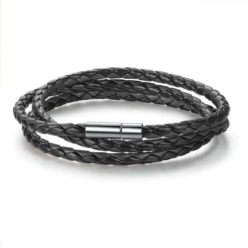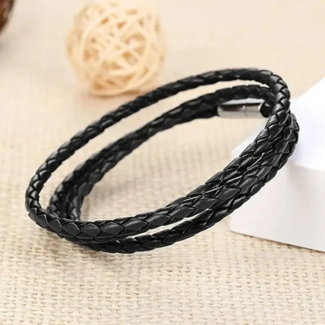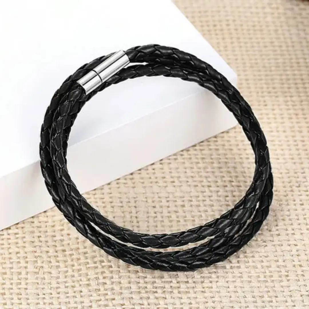 Dale un toque sofisticado a tu estilo con esta pulsera de cuero PU en color negro, diseñada para quienes buscan un accesorio moderno, resistente y fácil de usar. Su cierre magnético permite un ajuste seguro y sin esfuerzo, perfecto para el día a día.